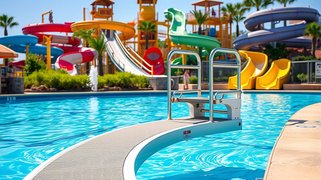 Water parks are designed with accessible features like ramps, zero-depth entry pools, and dedicated entrances to help you move easily. Pool lifts and waterproof wheelchairs make water activities safe and comfortable, often operated by staff for your convenience. Innovative features like support straps and sensory-friendly zones enhance inclusivity. With clear signage and barrier-free pathways, you’ll find steering effortless. Keep exploring to discover how these features can make your experience more enjoyable and accessible.