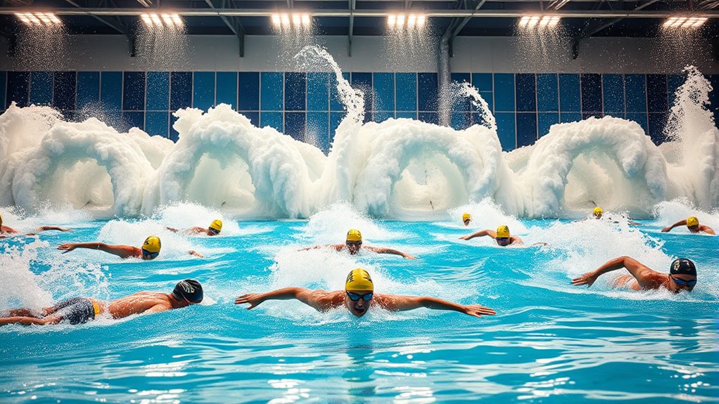 Specialized aquatic equipment transforms basic water exercises into high-impact, targeted workouts. Using tools like underwater treadmills, pool bikes, and resistance devices allows you to customize intensity and challenge your muscles uniquely. These machines enable low-impact, yet vigorous, HIIT sessions by adjusting resistance, speed, and movement patterns. Buoyancy belts support deep-water running or walking, reducing joint stress while maintaining effort. Resistance bands, gloves, and cuffs add muscular overload, especially when combined with wave pool currents that increase instability. Equipment like ankle weights and flotation devices further engage stabilizer muscles, making your workout more exhaustive. Incorporating these tools boosts effectiveness, helps you progress safely, and keeps your aquatic HIIT sessions dynamic and engaging. Additionally, the integration of automation technologies can optimize workout routines and track progress more efficiently.