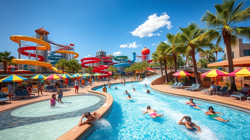 When planning a family day at the water park, finding areas designed specifically for young children enhances everyone’s experience. Kid-friendly water play areas offer safe, engaging fun, like shallow pools, splash pads, and gentle slides. At Hawaiian Falls Waco, Waikiki Waterworks features shaded play zones, while Kona Kooler lazy river offers a relaxed float suitable for all ages. PEPPA PIG Theme Park Dallas-Fort Worth has interactive play zones like Peppa’s Treehouse and Pirate Island Sand Play, perfect for toddlers. Kalahari Resort’s Coral Cove provides zero-depth entry and mini slides, and Epic Waters offers indoor shallow pools and gentle slides. These attractions ensure your little ones stay entertained and safe while creating memorable water adventures. Additionally, water safety education is vital for a fun and secure experience at these parks.