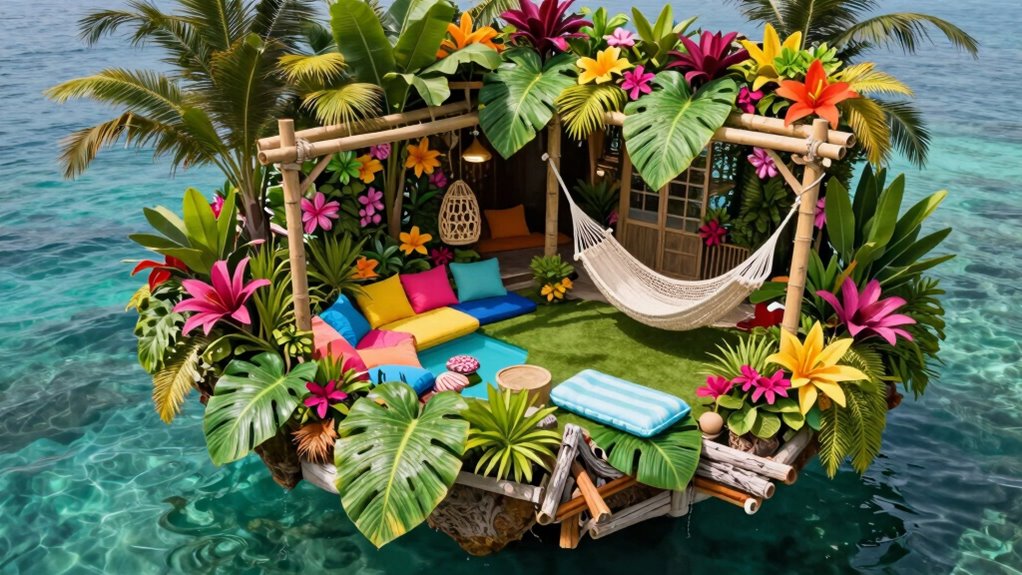 Floating islands elevate poolside elegance with plush cushions and sleek designs, transforming lounging into a sophisticated statement.