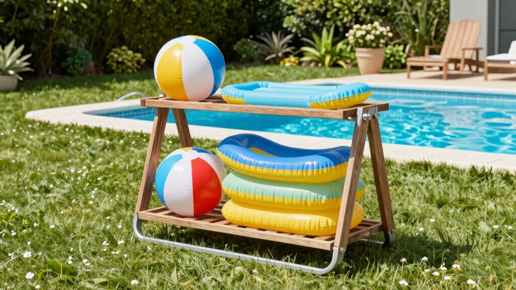 A pool toy rack typically lasts around 3 to 5 years, depending on its quality and exposure to the elements. Think of it as the backbone of toy organization—its durability keeps your backyard neat and safe. To extend its lifespan, regularly clean and inspect for rust or damage. With proper care, your rack can serve as a reliable, long-lasting solution, making poolside cleanup effortless and enjoyable.