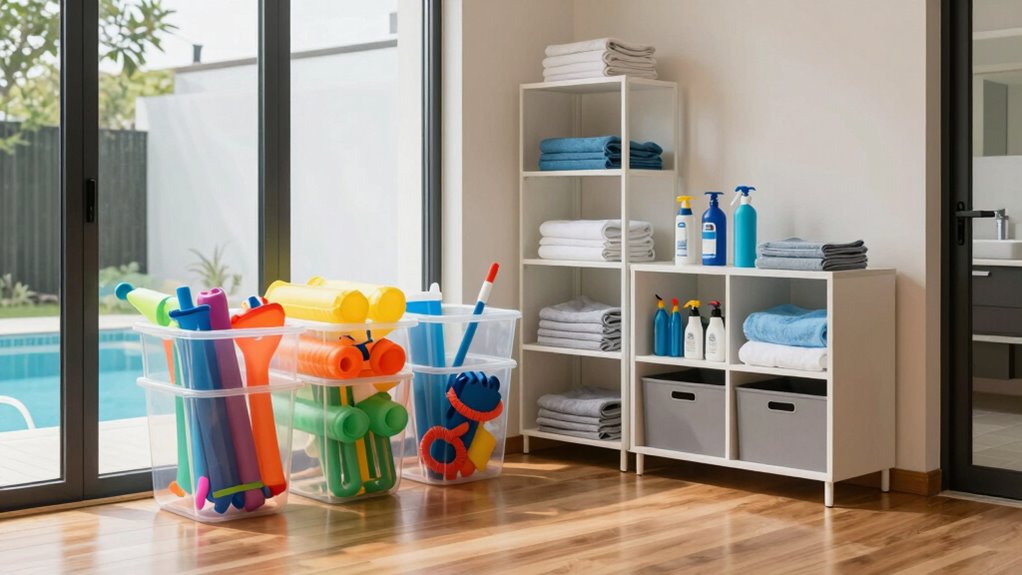 To keep your pool house organized during off-season months, focus on regular pool house cleaning to prevent dust and clutter buildup. Use seasonal storage tips like clear bins and labels to easily access items when needed. Store pool accessories, cleaning supplies, and outdoor furniture in designated areas, and consider installing shelving for better space utilization. This approach guarantees your pool house stays tidy and ready for use when the season returns.