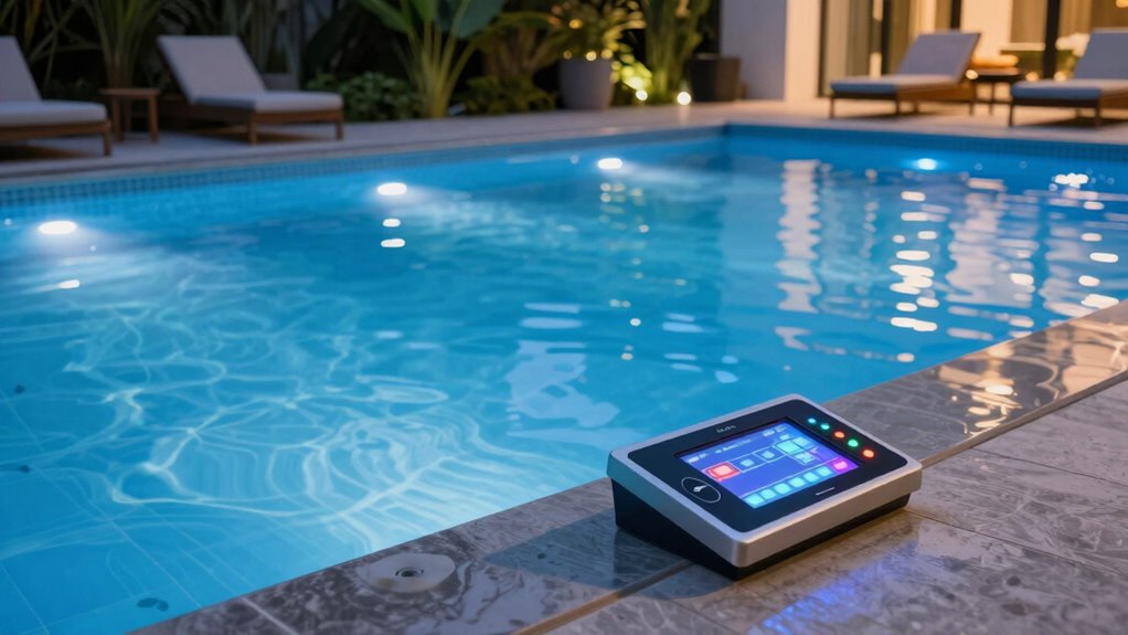A major advantage of these automation controls is their user interfaces. Designed to be intuitive and accessible, they come in the form of touchscreens, mobile apps, or even voice commands. You don’t need to be a tech whiz to operate them; instead, you get a straightforward way to customize your pool’s operation from anywhere. Whether you’re adjusting the temperature, scheduling filtration times, or monitoring chemical levels, the user interfaces simplify complex processes into clear, easy-to-understand controls. This seamless interaction ensures you spend less time fiddling with settings and more time enjoying your pool. Additionally, smart device integration enhances the functionality by allowing seamless connection with other home automation systems. Beyond basic control, these systems can monitor various aspects of your pool environment. You can set them to maintain specific temperature ranges, automatically turn on lights, or activate water features like fountains and waterfalls at desired times. Some systems even detect chemical imbalances or water levels, alerting you when maintenance is needed. This level of control not only improves your pool’s overall health but also extends its lifespan, reducing the likelihood of costly repairs or replacements. Incorporating monitoring technology can further help optimize your pool’s operation by providing real-time data and insights. Moreover, advanced sensors play a crucial role in detecting environmental changes that could impact your pool’s condition, helping prevent issues before they arise. Additionally, comprehensive system management allows for more detailed customization and integration options, enhancing user experience and operational efficiency. Furthermore, integrations with smart home systems allow you to create customized routines. For example, you might program your automation controls to prepare the pool for your afternoon swim, turning on the heater and adjusting the filtration just before you arrive home. These features provide convenience and peace of mind, knowing your pool is always ready for use with minimal effort. Additionally, understanding the pool environment through advanced sensors helps you anticipate potential issues before they become costly problems. Overall, smart pool automation controls regulate much more than the water; they govern the entire pool environment, making your maintenance routine smarter, more efficient, and more enjoyable.