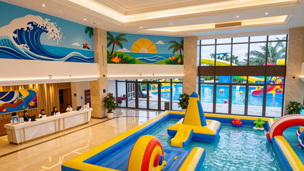 Water park hotels are great for young children, offering plenty of toddler amenities and age-appropriate pools. You should supervise your child closely around water, especially in busy areas. Many hotels provide shallow kiddie pools and dedicated play zones, making it easier to keep your little one safe and entertained. With proper child supervision, your young kids can enjoy the water park experience while you relax, knowing they’re in a secure environment.