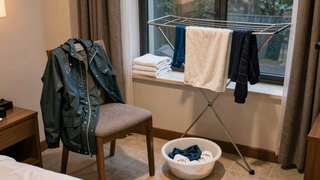Ever wondered how to keep your small hotel room organized when guests arrive with wet gear? Managing wet clothing, umbrellas, or towels can quickly turn a tidy space into chaos if you’re not prepared. The key is to implement efficient moisture control and streamline your hotel laundry process. When guests arrive with damp belongings, you want to guarantee their wet gear doesn’t spread moisture throughout the room, which can lead to unpleasant odors, mold, or damage to furniture. Setting up a designated spot for wet items is essential—preferably a well-ventilated area or a specific container that allows airflow. Using mesh bags or waterproof bins helps contain the moisture while keeping the rest of the room dry and clutter-free.
