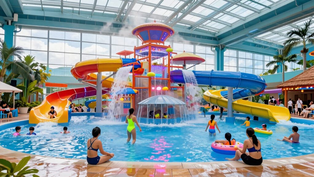 During off-peak seasons, indoor water parks attract visitors through seasonal promotions and themed events. You’ll find special discounts, package deals, and holiday celebrations that make the experience more appealing. These attractions create excitement and a sense of exclusivity, encouraging visitors to come even when outdoor parks are less crowded. By offering unique experiences and promotions, indoor water parks keep the momentum going year-round, appealing to families and thrill-seekers alike.
