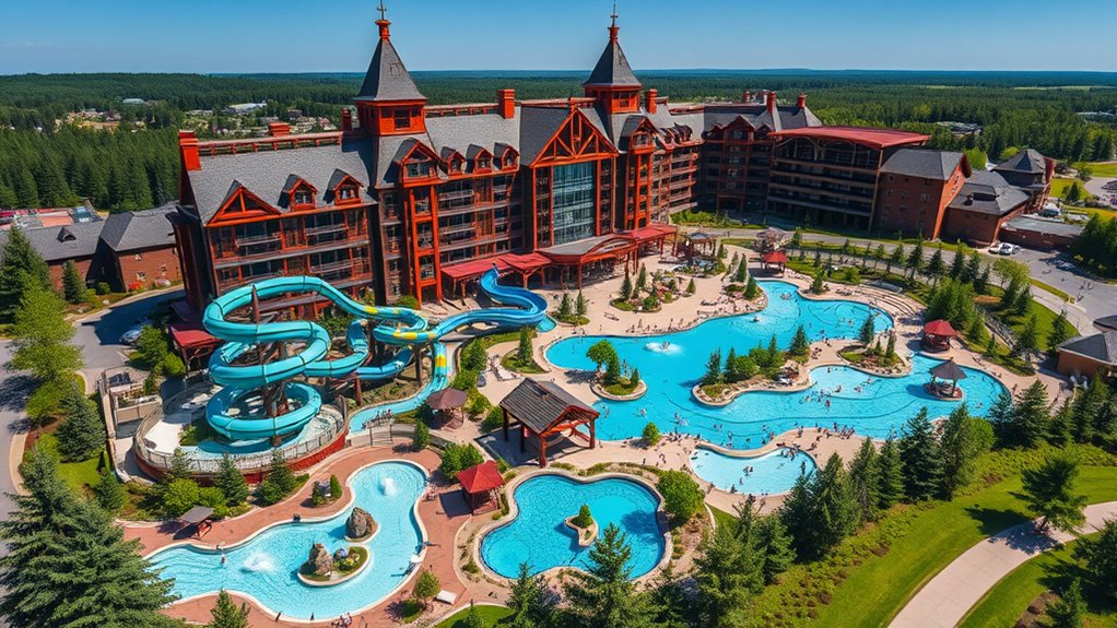 Year-round indoor water fun at Great Wolf Lodge Mashantucket offers a vast, temperature-controlled environment where guests can enjoy exciting water attractions regardless of the season. The 92,000-square-foot water park stays consistently at 84 degrees Fahrenheit, ensuring comfortable water and air temperatures year-round. You can explore a variety of water environments, including a wave pool, lazy river, and multiple play areas suited for all ages. The Otter Cave Waterworks features interactive water play structures with sprays, leaks, and a giant tipping bucket. With 13 modern slides—ranging from high-speed tube rides to family-friendly raft attractions—there’s thrill for everyone. The indoor setting means no weather-related closures, providing uninterrupted fun and relaxation for families anytime they visit. Additionally, the controlled environment aligns with smart indoor technology, which helps maintain optimal conditions for safety and energy efficiency.