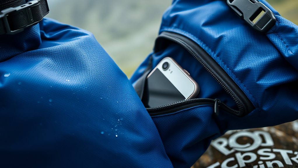 Dry bags are designed to protect your gear from water, but understanding their protective capabilities requires knowing about waterproof ratings like the IP Code. These ratings measure how well a bag prevents solids and liquids from entering, with common ratings like IPX6, IPX7, and IPX8. The higher the number, the better the protection—especially against submersion. For example, an IPX8-rated dry bag can keep contents dry even when fully submerged at depths of at least 1 meter. IP ratings provide a clear, standardized way to gauge waterproof performance beyond vague claims. Most dry bags are made from durable fabrics like nylon, polyester with PVC coatings, or polyurethane, with strong seams that prevent leaks. IPX8 rating certifies water resistance up to 100 feet deep, ensuring reliable protection in extensive water exposure. Understanding these ratings helps you choose a bag that can truly safeguard your phone and gear in water-prone environments.