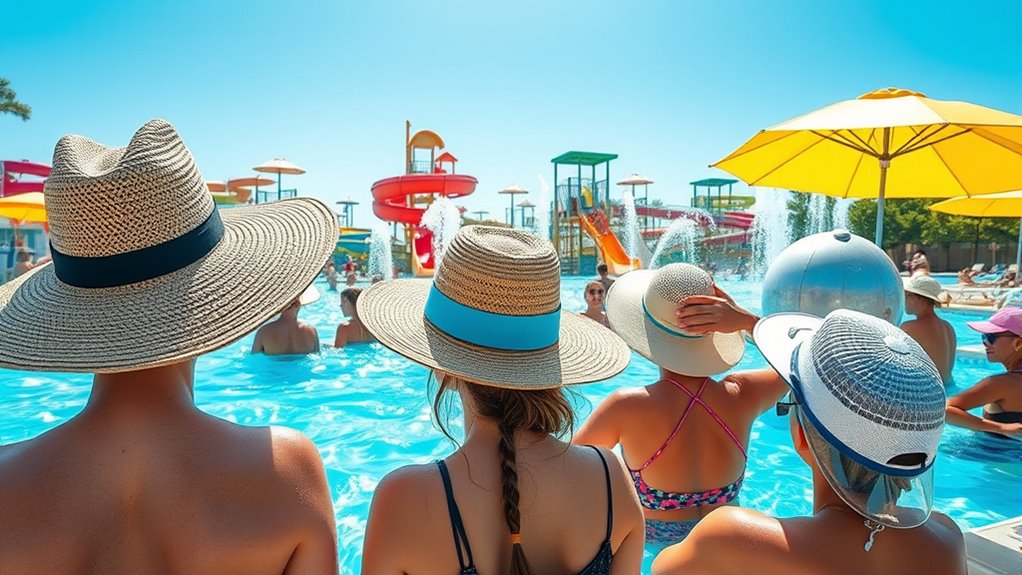 At water parks, hats and visors are often banned on high-speed or enclosed rides to prevent injuries and item loss, so make sure to remove or secure them beforehand. You can wear sun-protective gear like rash guards in pool areas, but always follow posted rules and staff instructions. To stay safe without hats, consider using secure straps, lockers, or alternative sun protection methods. Keep going to discover tips on how to stay safe and respect park policies.