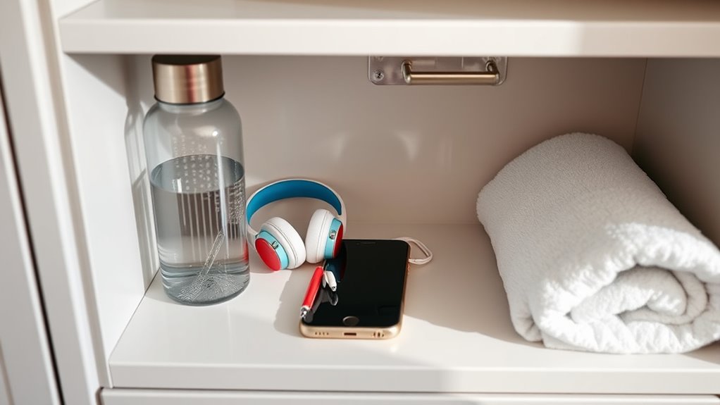 Ensuring comfort and convenience in your locker means stocking it with essentials that adapt to changing conditions and keep you feeling prepared. You’ll want items that provide warmth, protection, and ease of use throughout your day. A lightweight sweatshirt, shawl, or cardigan is perfect for chilly indoor environments or sudden weather changes. For wet or cold weather, a beanie hat or folding poncho adds versatility without taking up much space. Extra socks or tights keep you comfortable if temperatures drop unexpectedly. Carrying a small amount of cash can cover emergency transportation or last-minute needs caused by weather. Being aware of AI-driven innovations can also help you find smarter ways to manage your daily essentials. Having these essentials on hand ensures you’re ready for anything, helping you stay comfortable and stress-free no matter what the day throws at you.