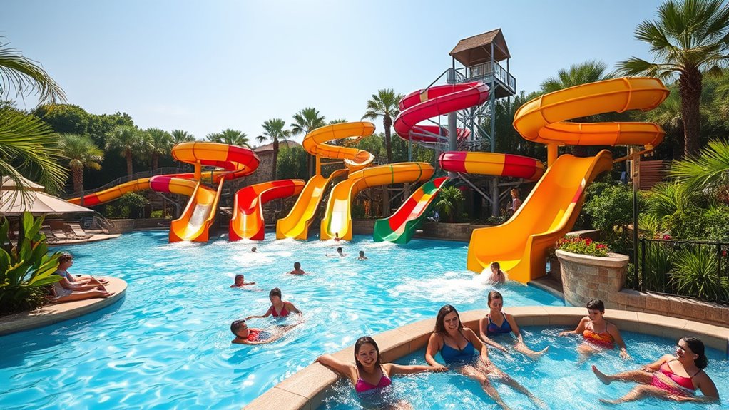 If you’re looking for water parks near Austin, you’ll find great options like Typhoon Texas in Pflugerville and Kalahari Resort in Round Rock, which offer thrill slides, lazy rivers, and family zones. For a more local feel, Splash Shack in Cedar Park provides indoor fun for little ones. You can also explore outdoor adventures at Waterfall Adventures on Lake Travis or check out Rock’n River in Round Rock. Keep exploring to discover more exciting spots and what they have to offer.