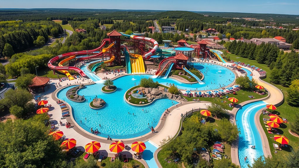 Imagine you’re planning a family trip and want on-site lodging; Gaylord Rockies Resort is your best bet. It offers exclusive access to Arapahoe Springs Water Park for overnight guests, ensuring convenience and comfort. Many resorts like Great Wolf Lodge in Colorado Springs provide integrated water parks with accommodations. While some parks partner with nearby hotels, staying on-site guarantees easy access, special amenities, and a hassle-free experience for your entire visit.