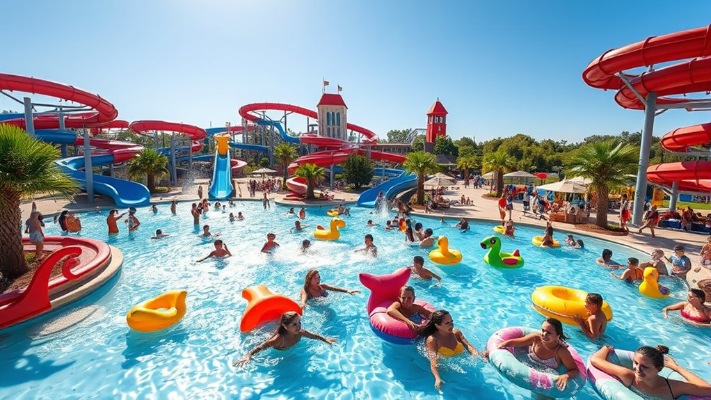Imagine a well-oiled safety net catching you if you fall—that’s how these parks protect you. They enforce rules like no running or rough play, require wristbands for access, and check height requirements for rides. Lifeguards are vigilant, trained to respond quickly, and conduct safety drills. Plus, they promote swim lessons and use PFDs for kids, creating a secure environment where you can relax and enjoy the fun worry-free.
