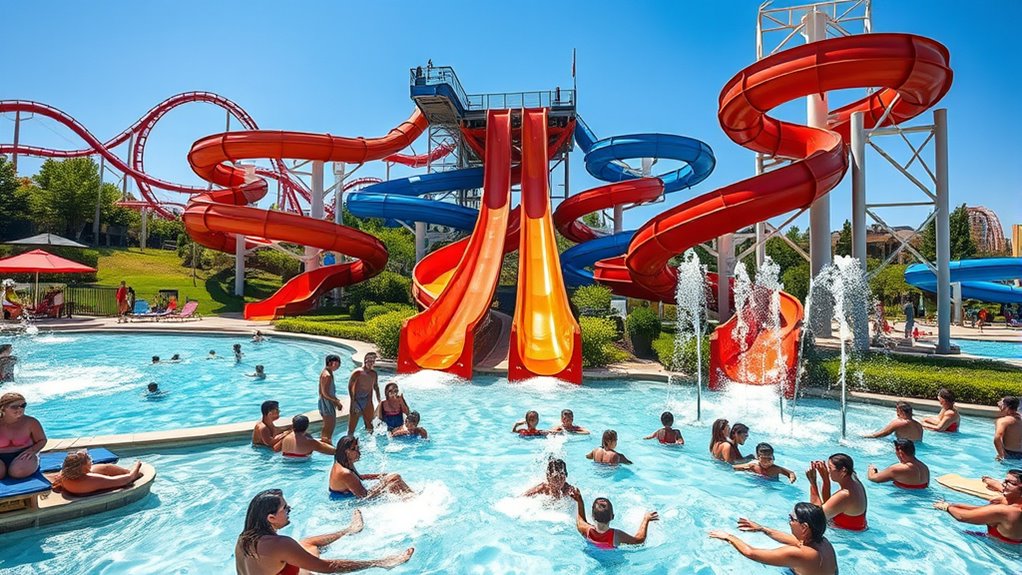 If you’re looking for water parks near Oklahoma City, you have great options like Six Flags Hurricane Harbor OKC with thrilling slides and lazy rivers, and OKANA Resort & Indoor Waterpark offering year-round indoor and outdoor fun. Community splash pads at Scissortail Park and Downtown OKC provide easy outdoor options, while First Council Casino Hotel features an indoor waterpark. Keep exploring to find the perfect splash zone for your family’s next water adventure.