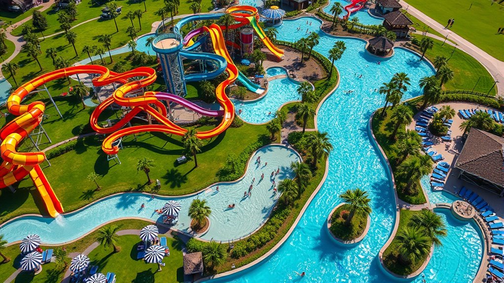 Thrilling water slides at Aquatica Orlando deliver adrenaline-pumping experiences combined with stunning aquatic views. Ihu’s Breakaway Falls is the tallest, steepest multi-drop tower slide, standing at 80 feet with four unpredictable drop capsules that send you plunging at an 80-degree angle. For a high-speed adventure through underwater scenery, Dolphin Plunge and Reef Plunge let you pass through aquariums with dolphins, sardines, and sharks, both over 300 feet long. Taumata Racer offers fast-paced racing on eight lanes, perfect for friendly competition, while KareKare Curl flings multiple riders up a 35-foot vertical wave wall, simulating weightlessness. Whether you’re seeking steep drops or racing thrills, these slides guarantee exciting water adventures for thrill-seekers. Water park attractions continue to evolve with innovative rides and enhanced safety measures to ensure fun for all ages.