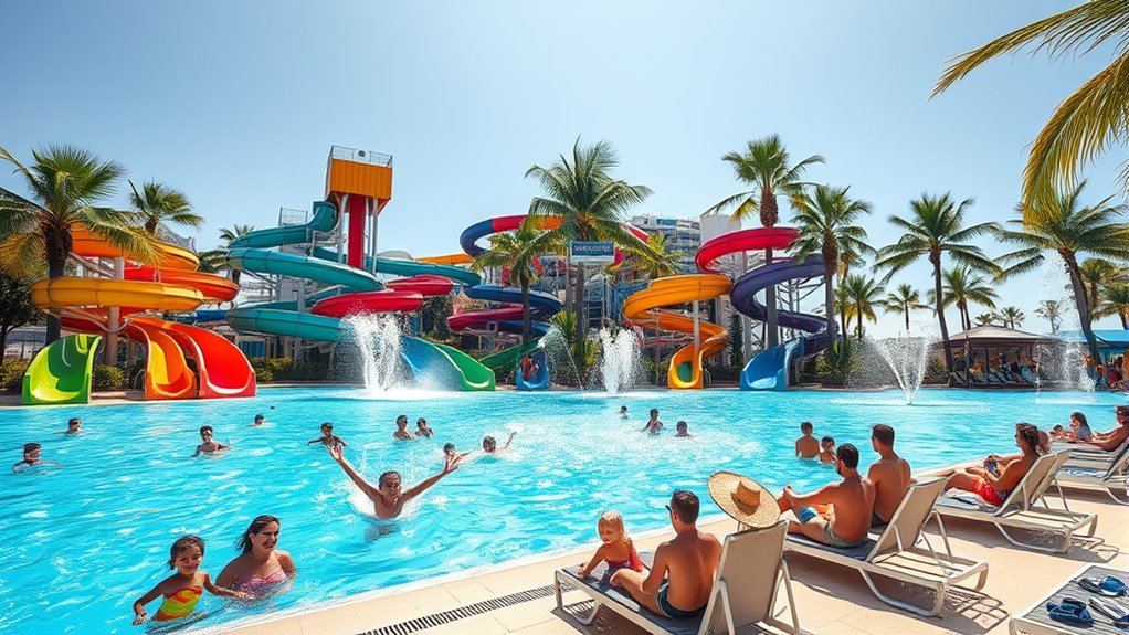 Think of water parks near Pittsburgh like hidden treasure chests, offering more than just water fun. Many provide on-site accommodations or nearby lodging packages, so you can stay close to the action. Resorts like Kalahari and Great Wolf Lodge have themed rooms, suites, and exclusive cabanas. You’ll enjoy perks like early access, bundled deals, and amenities such as pools and hot tubs, making your stay both exciting and relaxing.