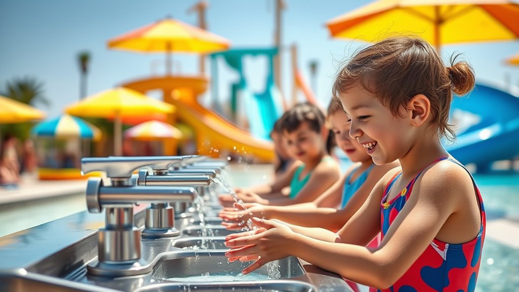 Proper hand hygiene is essential in water parks because it substantially reduces the spread of germs and prevents illness among guests and staff. When you wash your hands with soap and water for at least 20 seconds, you significantly lower the risk of transmitting diarrheal and respiratory diseases, which are often spread through contaminated hands. Despite its importance, only around 65% of women and 31% of men wash their hands after using public restrooms, highlighting the need for better compliance. Splashing from faucets can spread bacteria like Pseudomonas aeruginosa, so using anti-splash baffles and avoiding objects near faucet outlets is crucial. Ensuring access to proper handwashing facilities and encouraging regular hand hygiene can protect everyone, reducing illness and maintaining a safe, healthy environment in water parks. Incorporating hand hygiene protocols and promoting their consistent practice further enhances safety measures.