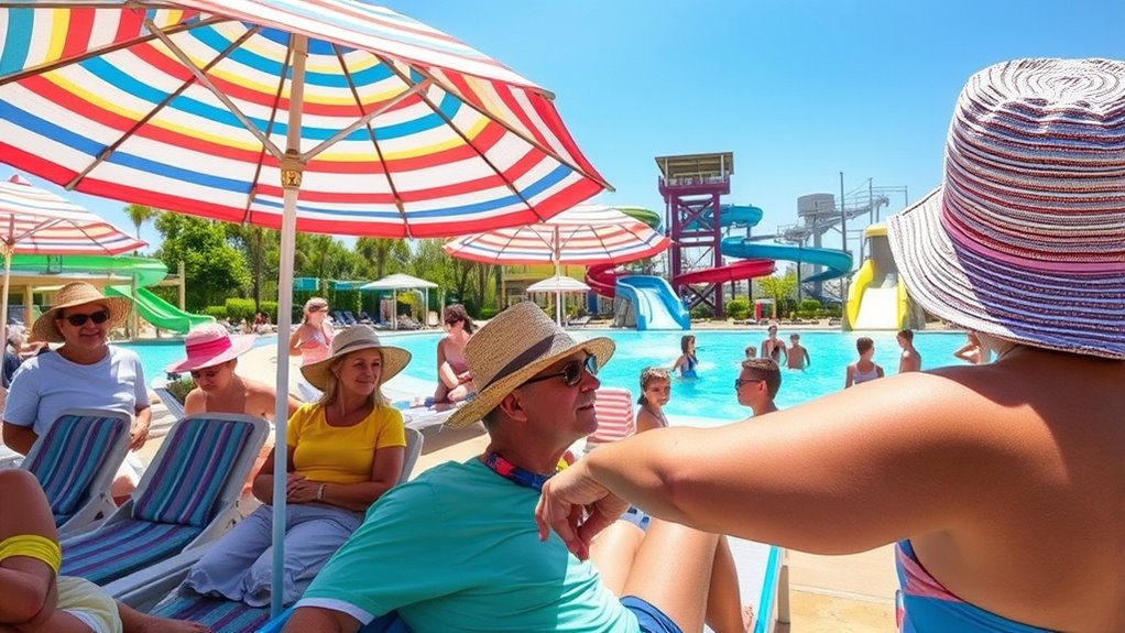 To get the most shade, look for designated shaded areas like pavilions and trees before settling in. Bring portable devices such as umbrellas or sunshades to cover yourself during peak sun hours. Planning your visit during off-peak times can also help you enjoy the water park with less direct sun exposure. Additionally, shade structures like fabric or steel shelters can significantly lower temperatures and provide a cooler, safer environment. Incorporating sustainable shading options can also reduce environmental impact while keeping you protected.