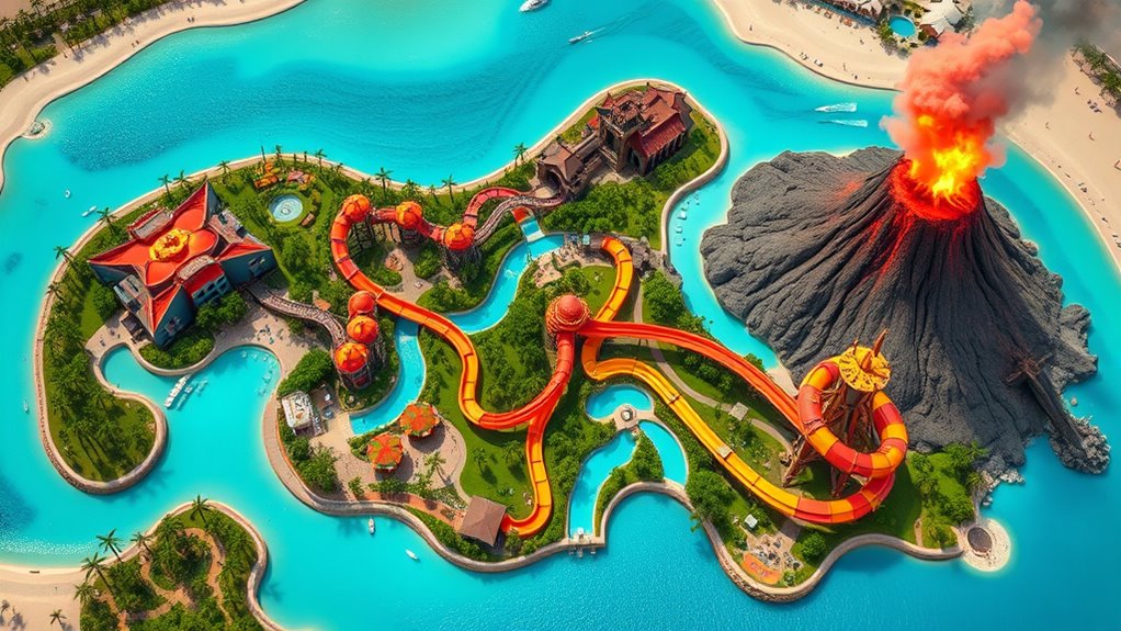 To make the most of your Volcano Bay visit, understanding the park’s map and layout is essential. The park spans 27 acres, with the iconic Krakatau volcano at the center, serving as the visual anchor. The four themed villages—River, Rainforest, Wave, and The Volcano—are clearly color-coded and mapped for easy navigation. The main entrance leads straight into the central plaza, offering direct sightlines to Krakatau. Restrooms, guest services, lockers, and dining options are strategically placed throughout the park. Pathways connect the villages, with no in-park transportation—walking is your main mode. Digital and printed maps, along with the Universal Orlando app, help you locate attractions, amenities, and show real-time updates, ensuring you can plan your day efficiently. Additionally, the map features icons indicating thrill categories, making it easier to choose attractions suitable for your preferences and the park’s layout is designed to facilitate easy access to all areas.