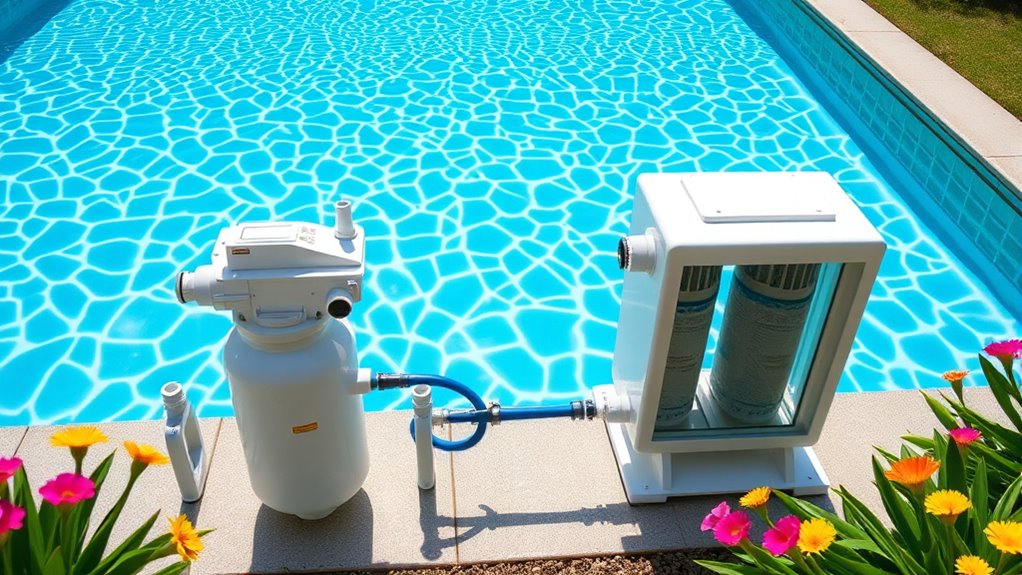 Cartridge filters themselves don’t require extra chemicals or treatments, but you still need to maintain proper water chemistry. I recommend regularly testing your pool water and balancing pH, alkalinity, and sanitizer levels. This ensures the filter works efficiently and keeps your water crystal clear. Additionally, cleaning the cartridges periodically is essential to prevent buildup and maintain ideal flow. Proper chemical balance and maintenance are key to a pristine pool.