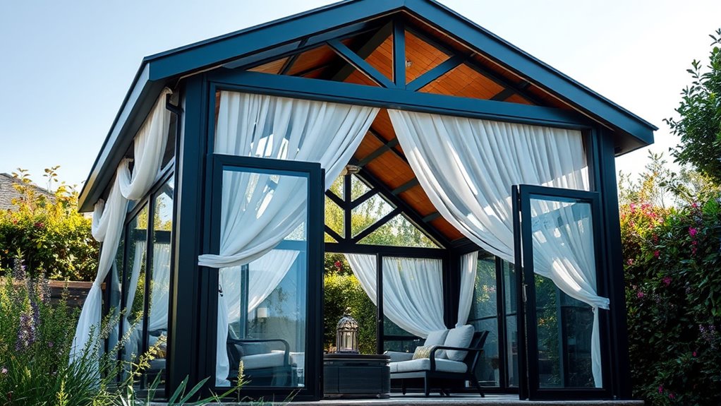 Selecting the right size and flexible configuration for your hardspa gazebo is crucial to guarantee it meets your outdoor living needs. You want a structure that comfortably fits your intended use—whether hosting 10-14 guests in a 12×20 ft space or accommodating furniture easily. Consider whether a fixed size or an expandable design suits your lifestyle better; adjustable or modular models offer the flexibility to reconfigure for different activities or seasonal changes. Pay attention to ceiling height and internal clearance to ensure ample headroom, preventing a cramped feeling. Finally, choose a size that fits well within your outdoor area, avoiding overwhelming the space or blocking pathways. Proper sizing guarantees comfort, functionality, and the ability to adapt as your needs evolve.