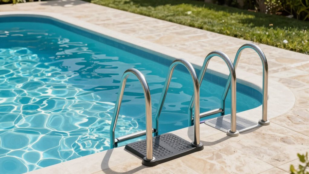 Choosing a pool ladder with the right safety features is essential to prevent accidents and guarantee peace of mind while enjoying your above ground pool. Safety features like anti-slip steps and secure handrails markedly reduce the risk of slips and falls, making entry and exit safer. Adjustable height and barrier locks enhance security by preventing unauthorized access and ensuring the ladder fits snugly over pool walls. A sturdy, corrosion-resistant frame and non-slip treads provide long-term safety and stability during use. Additional features like slide-lock barriers and lockable gates offer extra security, especially for pools with children. Proper safety features support higher weight capacities, accommodating users of all ages and sizes confidently. Prioritizing these features ensures a safer, more enjoyable swimming experience.