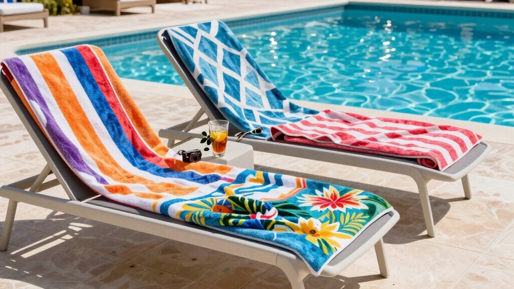 The right size and portability features can make all the difference when you’re packing for travel or heading to the pool. Choosing a towel that offers adequate coverage, whether oversized for full-body drying or compact for easy carrying, is key. Lightweight materials like microfiber help reduce bulk while remaining durable, and foldability makes storage simple. Look for towels that include carrying pouches or have their own compact pouches, so they stay organized and easy to stow away when not in use. Quick-drying fabrics considerably cut down drying time and prevent moisture buildup, which is especially useful on the go. Additionally, features like hanging loops or snap buttons make drying and hanging effortless, ensuring your towel is always ready when you need it.