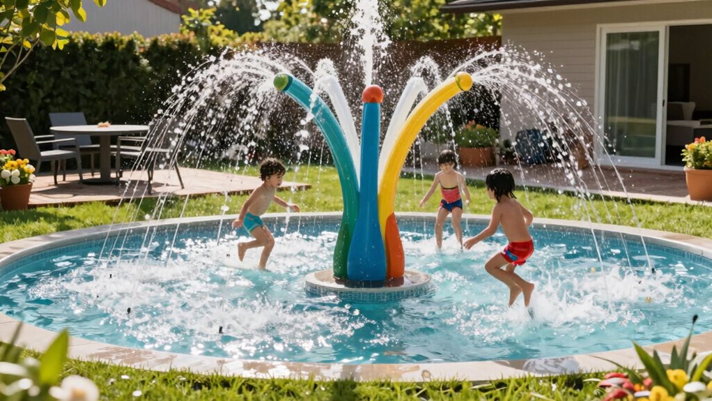 Ensuring safety features are in place is vital when selecting a backyard splash pad, as it helps prevent accidents and keeps kids protected during water play. First, I look for splash pads made from BPA-free, non-toxic materials to guarantee safety for children and pets. Non-slip textured surfaces are essential to prevent slips and falls, especially when kids are running around. Reinforced seams and leak-resistant features help avoid water hazards caused by leaks. Adjustable water pressure controls are a great addition, allowing me to regulate spray height and intensity, reducing the risk of injuries. Finally, I verify that the splash pad complies with safety standards like ASTM or CPC certifications, giving me peace of mind that it meets established safety guidelines.