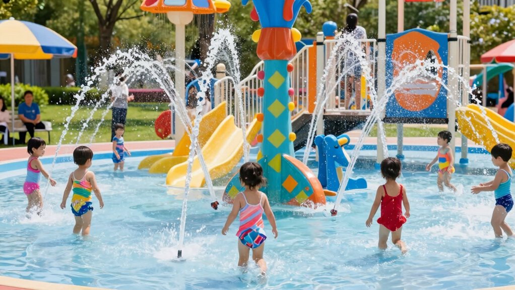 Did you know that over 65% of parents prefer age-specific splash pads for their little ones? Yes, there are splash pads designed especially for toddlers and preschoolers, with features like lower water levels and softer sprays. These guarantee safety and fun tailored to their age. I always recommend choosing one with gentle jets and shallow pools, so your kids can splash happily without worry.