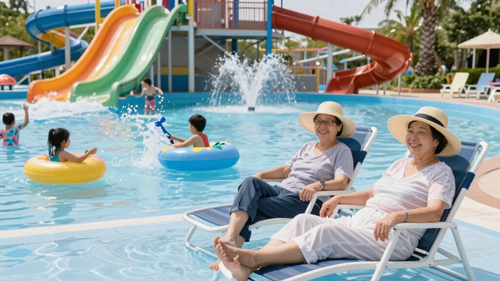 To make a water park day easier for grandparents, plan ahead by packing sun protection like hats, sunglasses, and high-SPF sunscreen, and bring plenty of water to stay hydrated. Provide shaded spots for breaks and keep snacks handy to maintain energy. Choose comfortable footwear and take regular rest breaks to prevent fatigue. Be aware of heat and air quality concerns, and watch for signs of heat-related issues. Keep exploring for more tips to guarantee a fun, stress-free day.